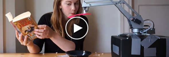 Advertisement Amazing video posted by Simone Giertz with the caption “I tried programming a robot arm to feed me breakfast. Things get pretty messy…”Whence cometh the Breakfast Machine – a truly disruptive solution to coping with the trials and tribulations of having to be a responsible, breakfast-eating adult, whatever