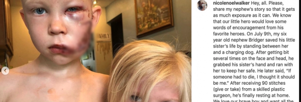 A little boy in Wyoming got a big shout-out from actor Chris Evans, who praised the child’s bravery in saving his kid sister from an attacking dog. Six-year-old Bridger Walker was horribly mauled last week when he stepped between a lunging dog and his younger sister. Bridger’s swollen and